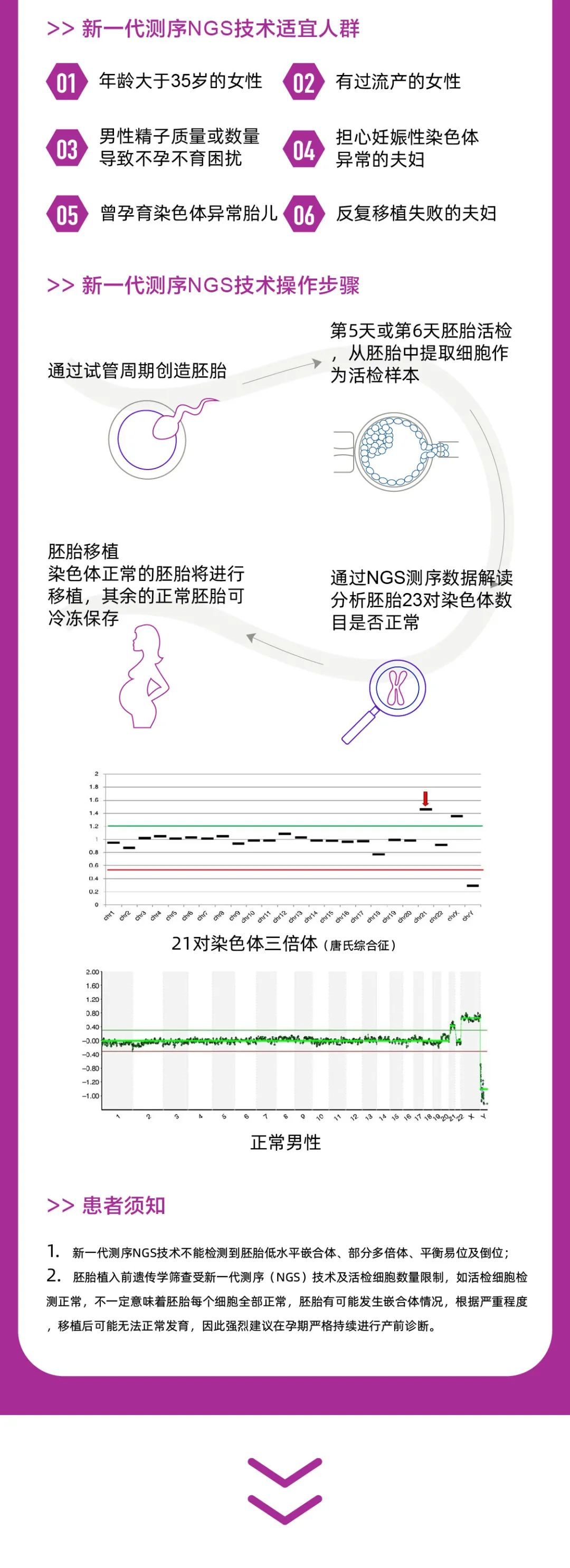NGS技术是目前全球试管技术筛查胚胎染色体技术中最新且移植成功率最高的,和FISH技术一样都属于第三代试管技术PGT-A筛查胚胎染色体的非整倍性。NGS技术能更全面的筛查胚胎全部(23对)染色体,通过NGS筛查的胚胎比五对染色体筛查具有更高的移植着床率及活产率。另外,胚胎五对染色体筛查使用荧光技术存在色差影响筛查准确度,而NGS技术通过测序数据解读准确度则更高。但不是所有的23对染色体筛查都叫NGS,除了NGS还有a-CGH,NGS比a-CGH具有更高灵敏度,尤其在检测嵌合体问题上。此外还有Karyolite BoBs(KL-BoBs)技术,KL-BoBs的检测灵敏度则比a-CGH更低。更多试管婴儿技术的了解,记得关注我们!